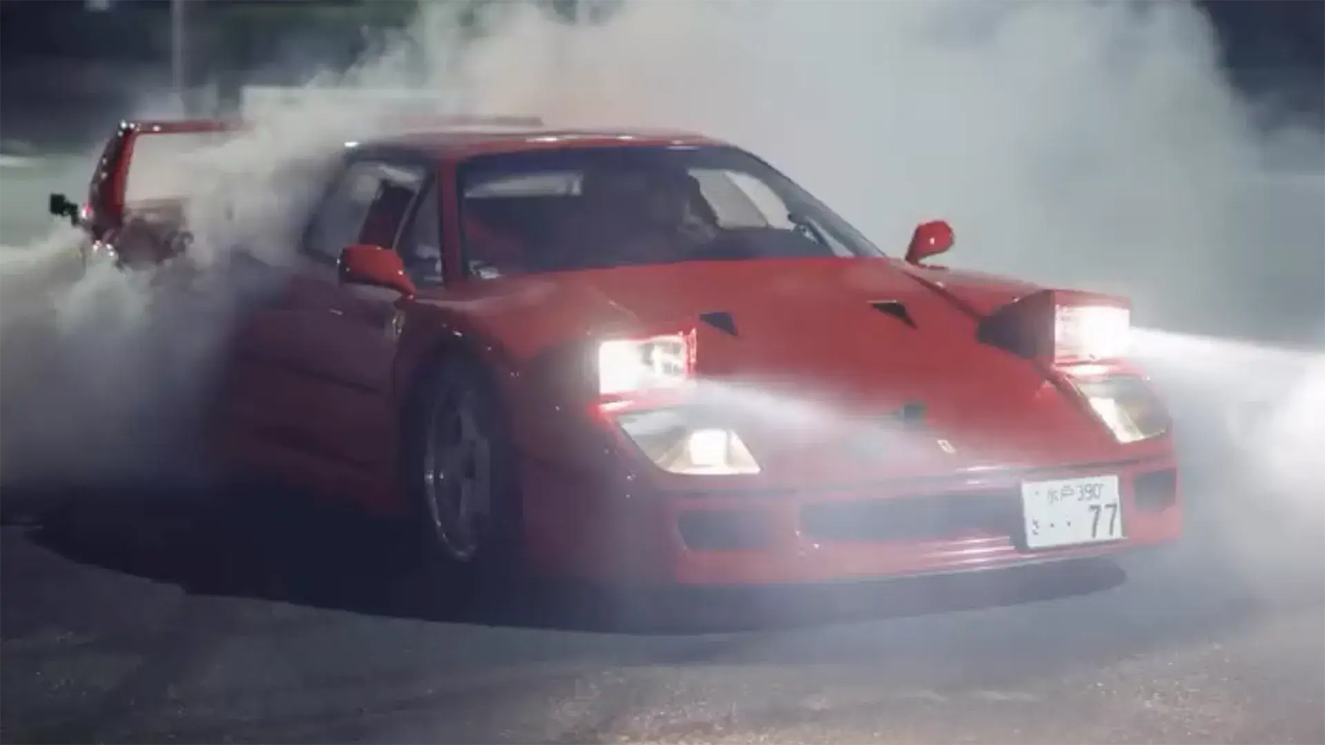 The video features rapid-fire cuts of Hamilton drifting, doing donuts and burnouts, and threading the F40 through Tokyo streets in a convoy, plus shots of the vehicle at the capital’s iconic Daikoku car meet.